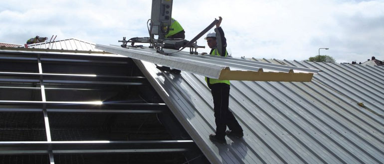 Работать краном, выполняя монтаж кровельных сэндвич панелей для крыши, не требуется. Поднять изделия можно своими силами. Для этого используют такое приспособление как присоски. Но все же требуется минимум 2 человека. Актуально только для частных домов и невысоких построек. В остальных случаях нужна техника.